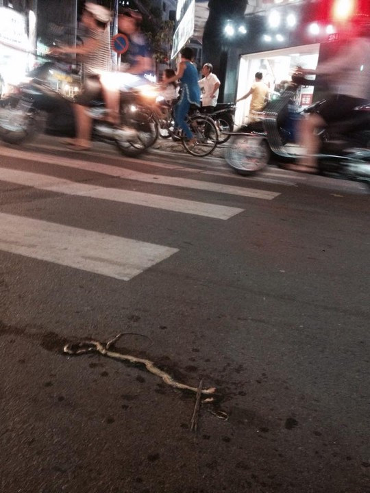 Chiều 22/6, trong lúc hàng chục khách hàng đang mua giày tại một cửa hàng ngay giao lộ Nguyễn Trãi – Huỳnh Mẫn Đạt (quận 5), bỗng dưng có người thảng thốt la lớn: “Rắn, rắn lục đuôi đỏ kìa”. Nghe vậy gần 10 người gần đó chạy tán loạn. Ông Phú (44 tuổi) gần đó nhanh tay chạy tới cầm đuôi quật tới tấp, khiến con rắn chết tại chỗ.
