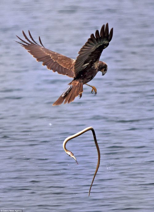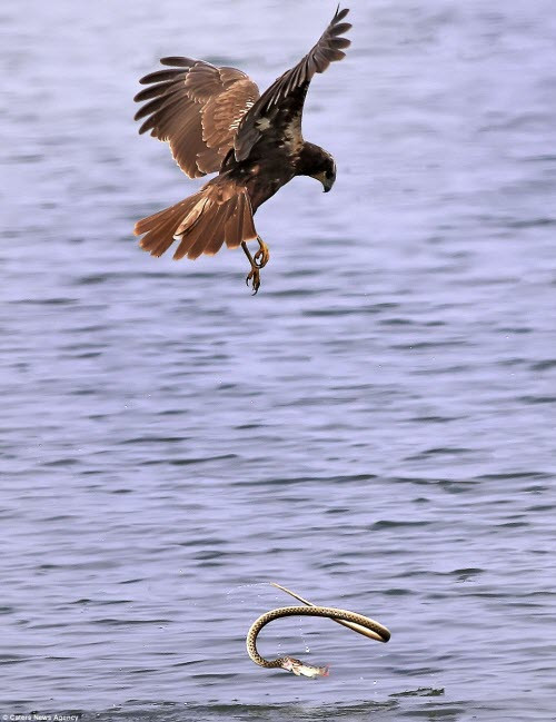 Đại bàng bay khỏi mặt hồ cắp theo cả rắn và cá, nhưng không thể giữ con mồi được lâu và con rắn sau đó đã lao trở lại hồ với con cá trong miệng.