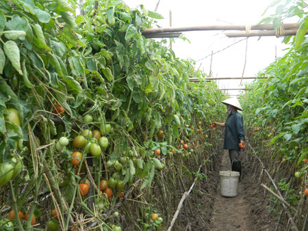 Gần đây, giá cà chua cũng chỉ nhỉnh lên đôi chút, thỉnh thoảng có nơi bán được với giá 3.000 đồng một kg, tuy nhiên, nhà vườn vẫn chịu cảnh lỗ nặng. Bởi lẽ, cây giống cũng như chi phí chăm sóc tăng cao hơn so với mọi năm. Ảnh: MH