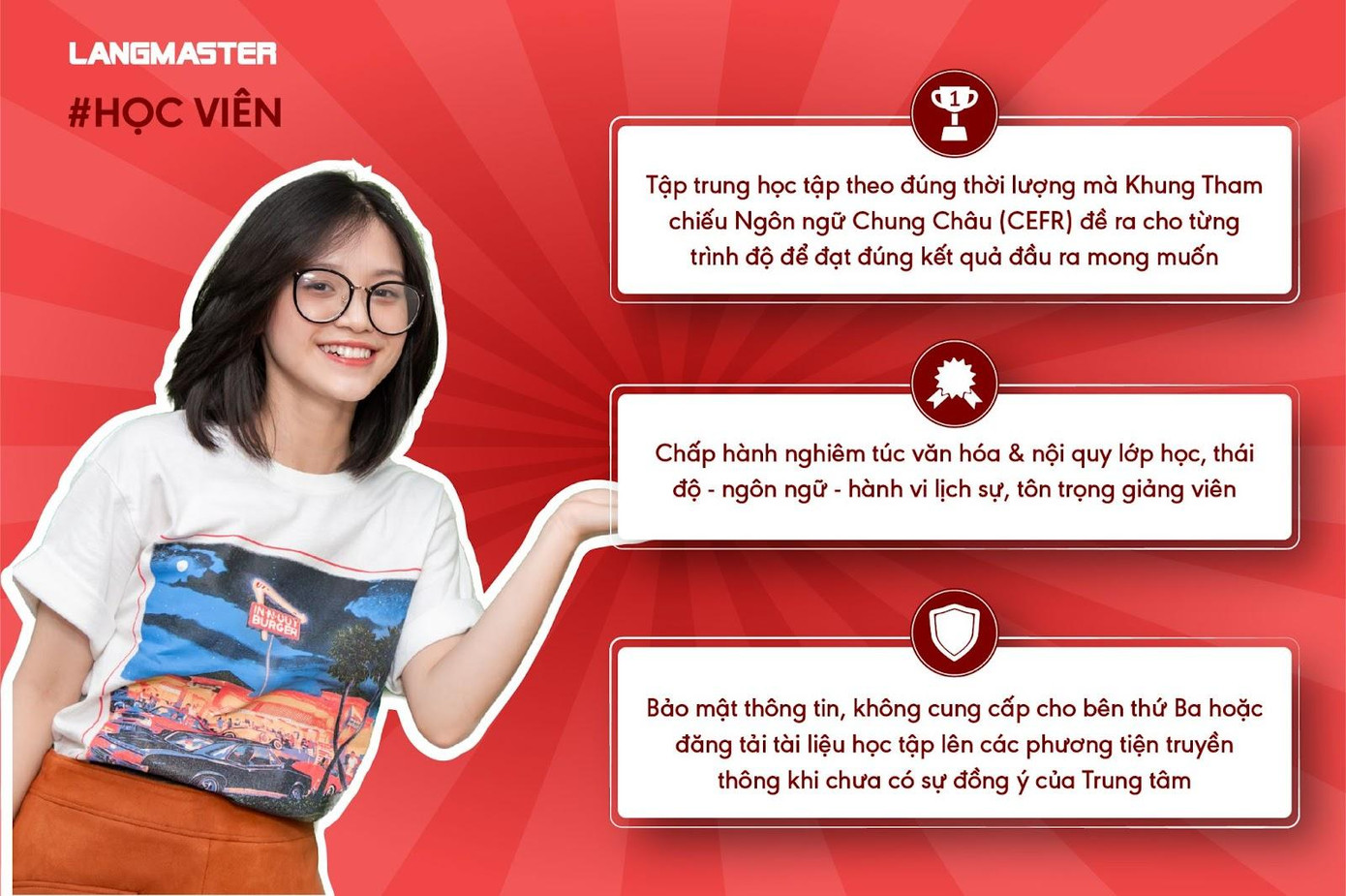 Tiếng Anh kỷ luật chính là một nét riêng trong quá trình dạy và học tại Langmaster. Có thể nói, cam kết 3 bên của Langmaster giống như chiếc kiềng 3 chân để giúp hoàn thành mục tiêu là nâng cao năng lực tiếng Anh của học viên.