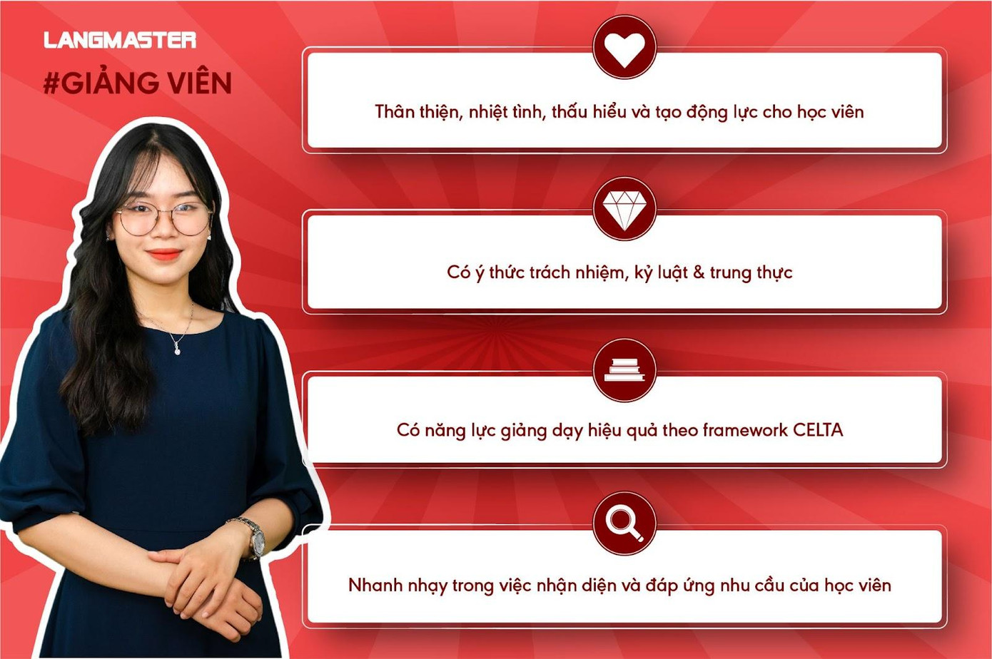 Được biết, Langmaster đưa ra yêu cầu khá cao đối với các vị trí giáo viên tiếng Anh. Theo đó, tất cả các giảng viên chính thức tại trung tâm đều phải đạt ít nhất IELTS 7.5 trở lên (tương đương TOEIC 900) với khóa học offline; và IELTS 7.0 trở lên (tương đương TOEIC 850) với khóa học online. Ngoài ra, mỗi thầy cô đều phải sở hữu các năng lực giảng dạy như: Năng lực giảng dạy từ vựng theo framework CELTA; Năng lực giảng dạy ngữ âm; Năng lực giảng dạy kỹ năng Nghe - Đọc - Viết - Nói theo framework CELTA; Năng lực giảng dạy tiếng Anh theo phương pháp ELC; Năng lực nhận diện và đáp ứng nhu cầu của học viên;…
