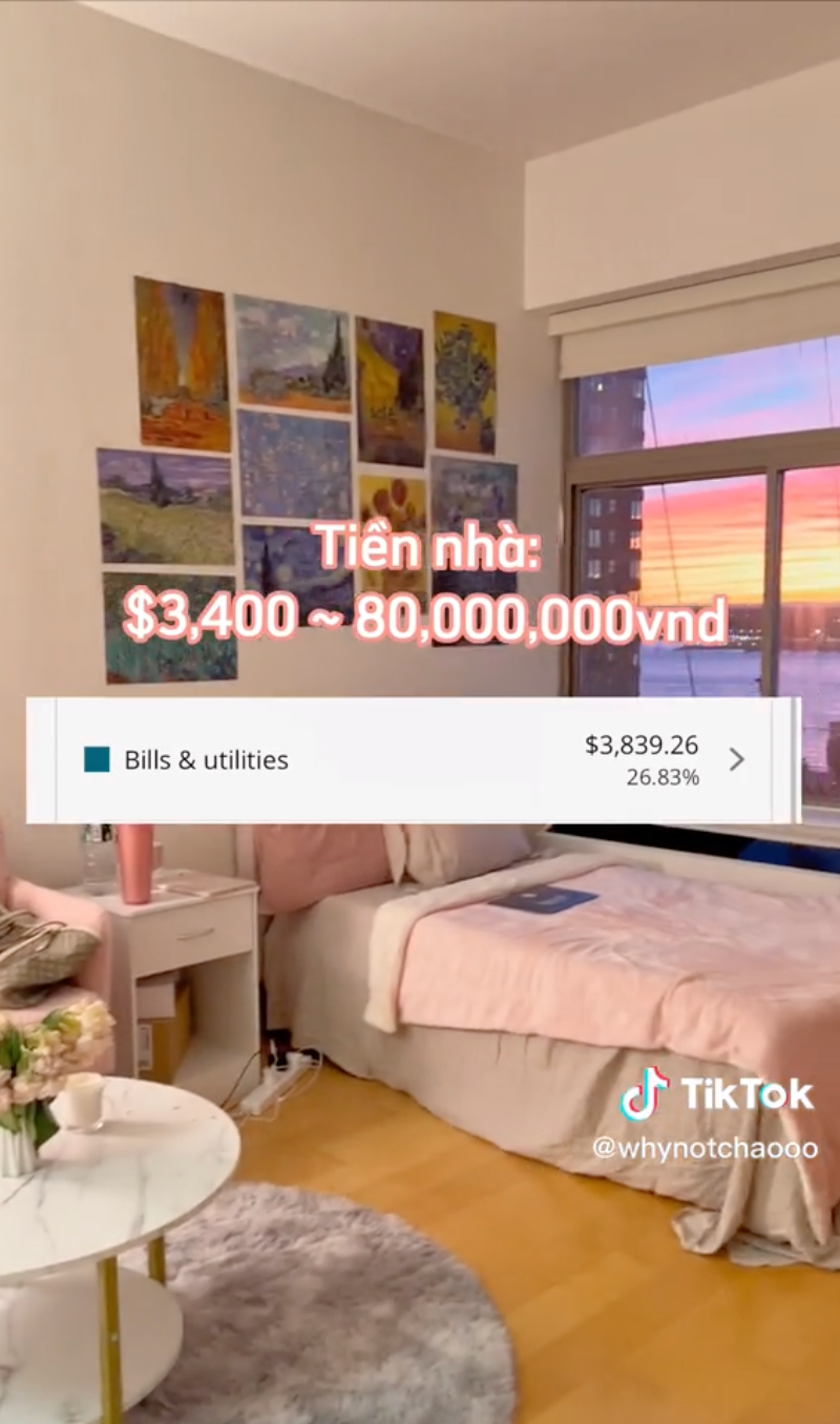 Học phí mỗi tháng là 8000 USD (tương đương 190 triệu đồng), chi phí ăn uống khoảng 50 triệu đồng, mua đồ siêu thị khoảng 13 triệu đồng, chi phí mua sắm khoảng 78 triệu đồng, chi phí di chuyển bằng tàu điện ngầm là 132 USD (tương đương 3,1 triệu đồng)... Tổng chi phí 1 tháng du học tại NewYork của Chao là khoảng 17.500 USD (tương đương 417 triệu đồng).