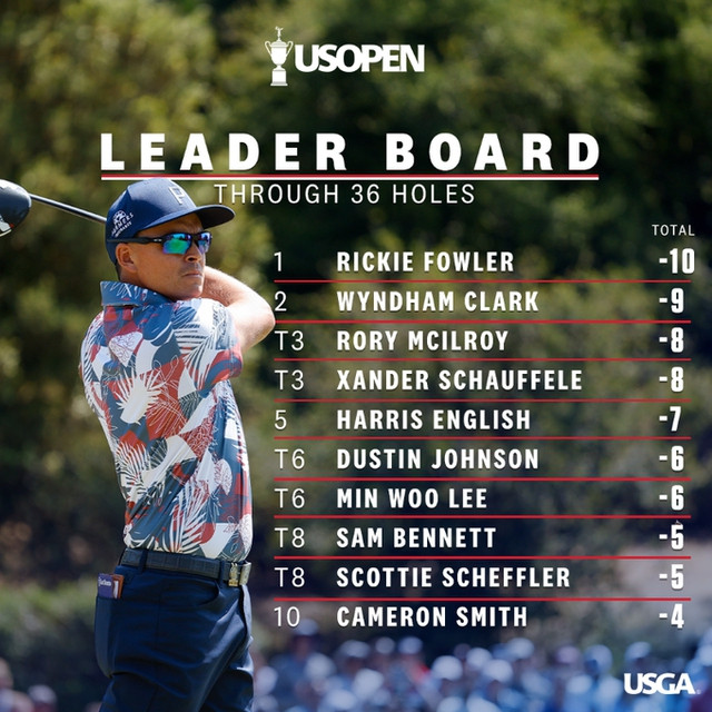 Sau 2 vòng, Wyndham Clark xếp sau Fowler với 1 gậy cách biệt. Cựu số 1 thế giới Rory McIlroy và Xander Schauffele, đồng hạng 3 với tổng điểm (-8).