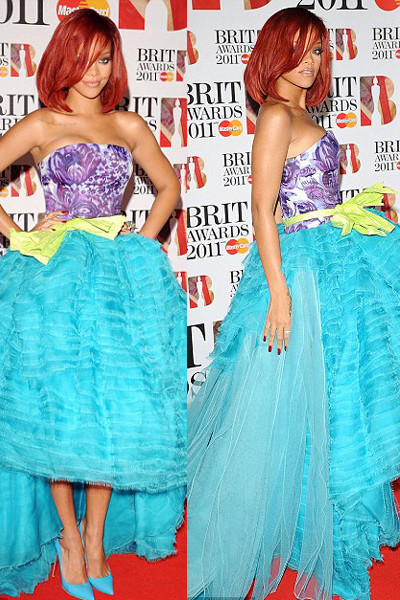 Những trang phục mà Rihanna diện tại lễ trao giải đều là của các nhà thiết kế danh tiếng. Trước khi biểu diễn trên sân khấu, Rihanna mặc đầm cao cấp của Christian Dior và sau đó thiết kế của Oscar de la Renta.