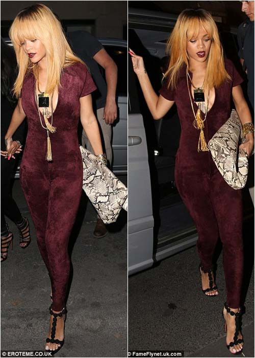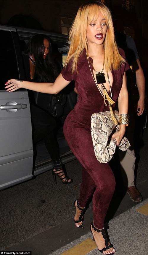 Rihanna diện một bộ jumpsuit với chất liệu nhung màu tím sang trọng, phần cổ xẻ sâu táo bạo đã giúp cô nàng khoe trọn được vòng một cực kỳ nóng bỏng.