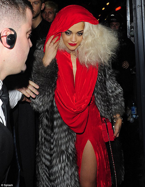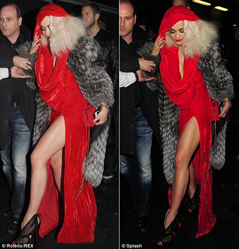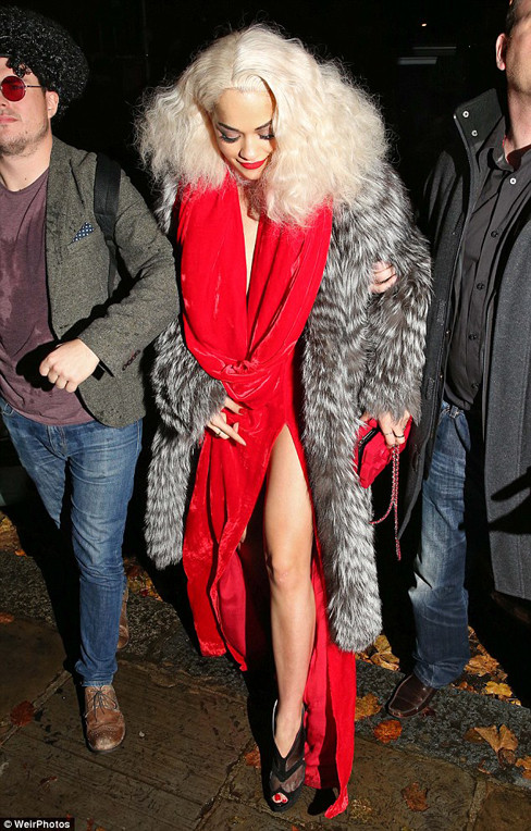 Diện bộ đầm dạ hội màu đỏ rực vô cùng nổi bật, Rita có màn khoe chân táo bạo với phần xẻ đùi cao ngút. Cô cũng làm tóc xoăn và trang điểm quyến rũ với đôi môi đỏ đậm theo phong cách của những thập niên 70.
