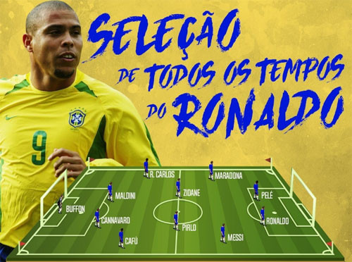 Ronaldo đưa ra đội hình hay nhất khi được yêu cầu trong cuộc trả lời phỏng vấn trên Esporte Interativo, hôm 6/10. Cựu danh thủ của Real và tuyển Brazil nêu 11 cái tên gồm thủ môn Buffon, trung vệ Cannavaro, Maldini, hậu vệ trái Roberto Carlos, hậu vệ phải Cafu, tiền vệ trung tâm Zidane, Pirlo, cầu thủ chạy cánh phải Messi, cầu thủ chạy cánh trái Maradona, trung phong Pele và bản thân.