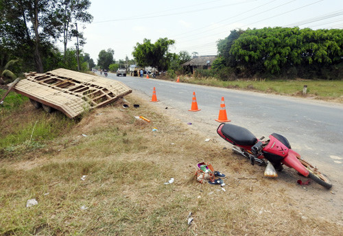Sáng 10/3, Trần Thanh Liêm (36 tuổi) chạy xe ben chở đất trên đường 790, huyện Dương Minh Châu, Tây Ninh. Phía đuôi xe ben kéo theo rơ-moóc. Đang chạy, rơ-moóc bất ngờ bị trượt móc kéo, rơi khỏi xe ben, tông vào hai xe máy đang chạy.
