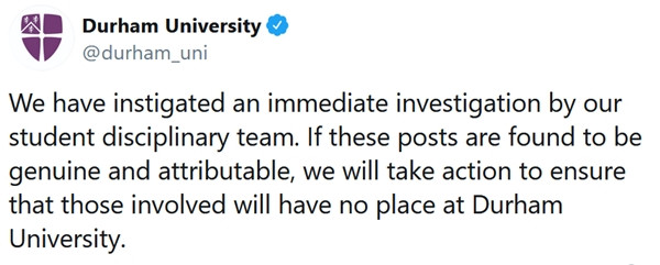 Về phía mình, trường Durham nói, họ đã nắm thông tin về “những lời bình luận ghê tởm” nói trên và đang tích cực điều tra. Họ viết: “Chúng tôi sẽ có hành động để đảm bảo rằng, những người liên quan sẽ không có chỗ để ở lại ĐH Durham”.