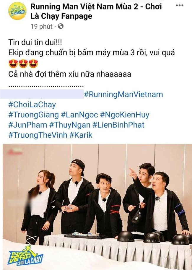 Gần đây, fanpage chính thức của chương trình Running Man Vietnam bất ngờ thông báo chuẩn bị bấm máy quay mùa 3. Từ sau chương trình Sóng 22, khán giả đã lâu chưa được thấy dàn cast Running Man Vietnam mùa 2 cùng hội ngộ. Có lẽ vì vậy nên khi nhận được thông báo mới từ chương trình, dân tình gần như xôn xao. Hiện tại, bài đăng trên trang fanpage chương trình thu hút gần 8.000 lượt yêu thích với hơn 600 lượt bình luận.