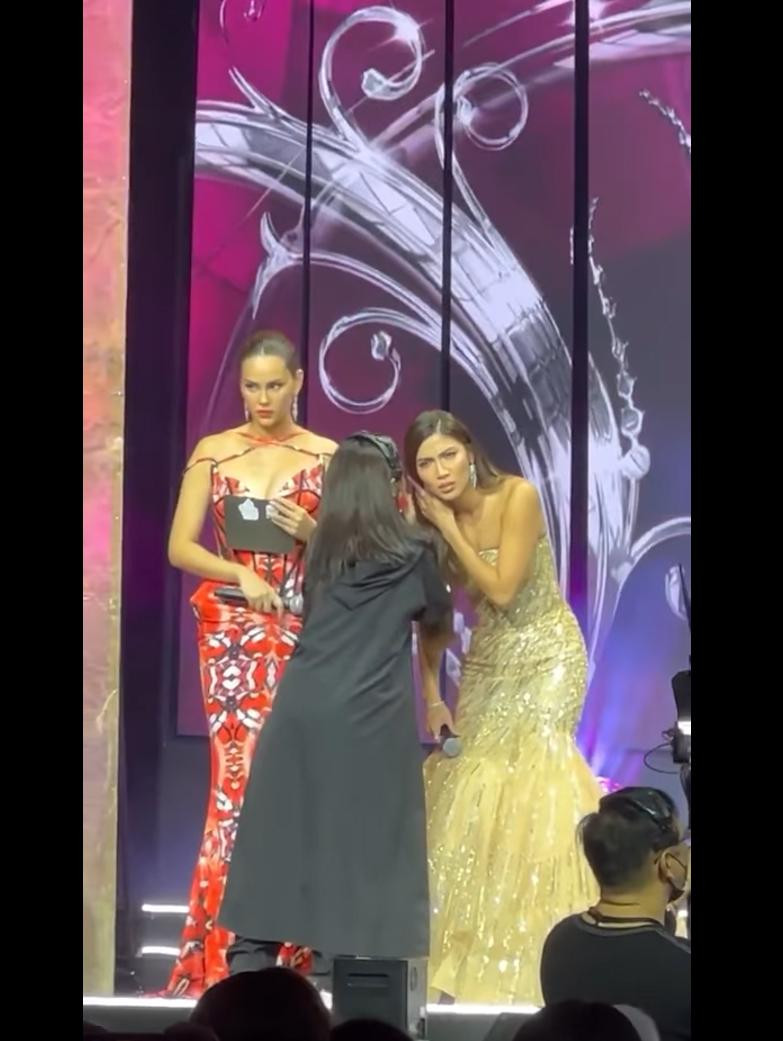 Sau đó, một thành viên thuộc ê-kíp của BTC chạy lên sân khấu để trao đổi với hai MC là cựu Hoa hậu Hoàn vũ Catriona Gray và người đẹp Nicole Cordoves. Trong clip, gương mặt của hai MC tỏ ra bối rối, hoang mang. Catriona Gray còn mở lại tờ giấy ghi kết quả khi nói chuyện với người này.
