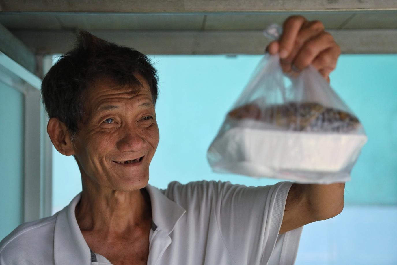 "Mấy nay dịch bệnh chỉ ngồi ở nhà, lớn tuổi rồi cũng không dám ra đường vì nhà nước khuyến cáo người hơn 60 tuổi dễ mắc bệnh. Nhận được hộp cơm tôi vui và hạnh phúc lắm, nhờ nó cứu đói cho tôi và anh em bán vé số dạo", ông Bành Văn Sâm (62 tuổi, Bình Thuận) phấn khởi nhận suất ăn từ đại diện Grab