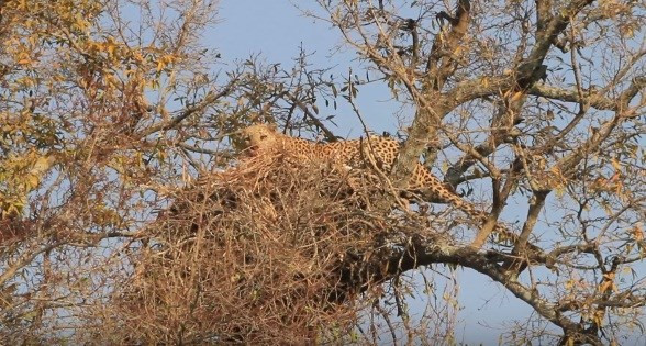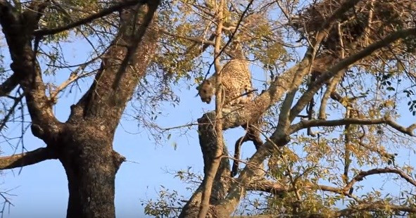 Khi báo đốm leo lên tổ chim đại bàng cá châu Phi, nó không hề kiêng dè chim đại bàng bố đang đậu gần đó.