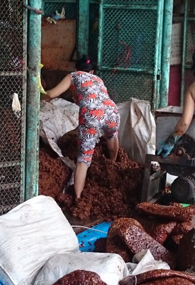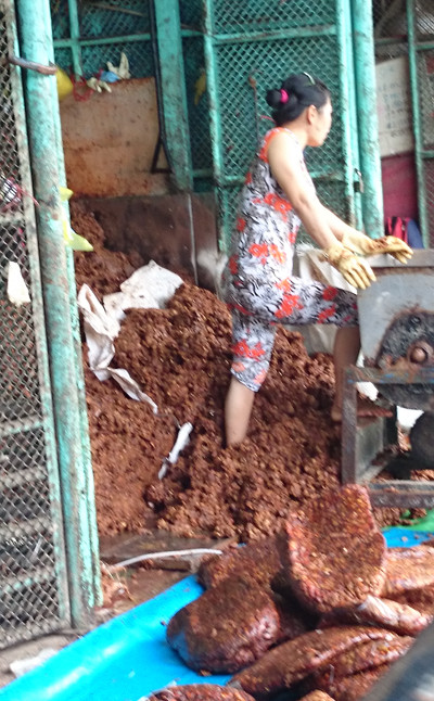 Ba người phụ nữ, một người đàn ông đi chân đất giẫm đạp lên me, rồi đóng thành từng khối bày la liệt trên nền đầy rác.