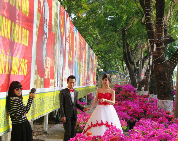 Các bạn trẻ mượn sắc hoa tết trên đường Lưu Tấn Tài, phường 5 (TP Cà Mau) để chụp ảnh cưới.
