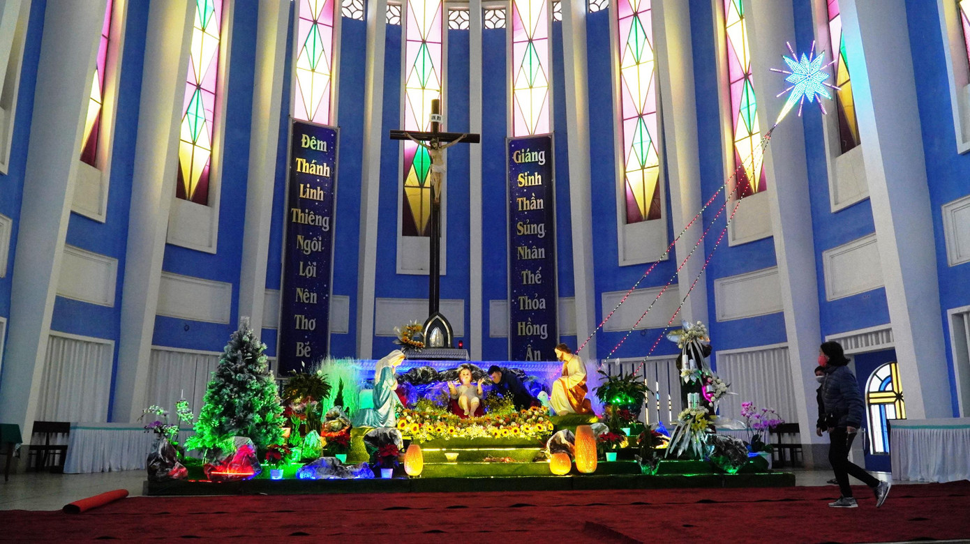 | Trước đó, các nhà thờ đã hoàn tất trang hoàng không gian bên ngoài, thiết trí hệ thống chiếu sáng, các câu chữ mừng chúc Thiên Chúa Giáng sinh. |