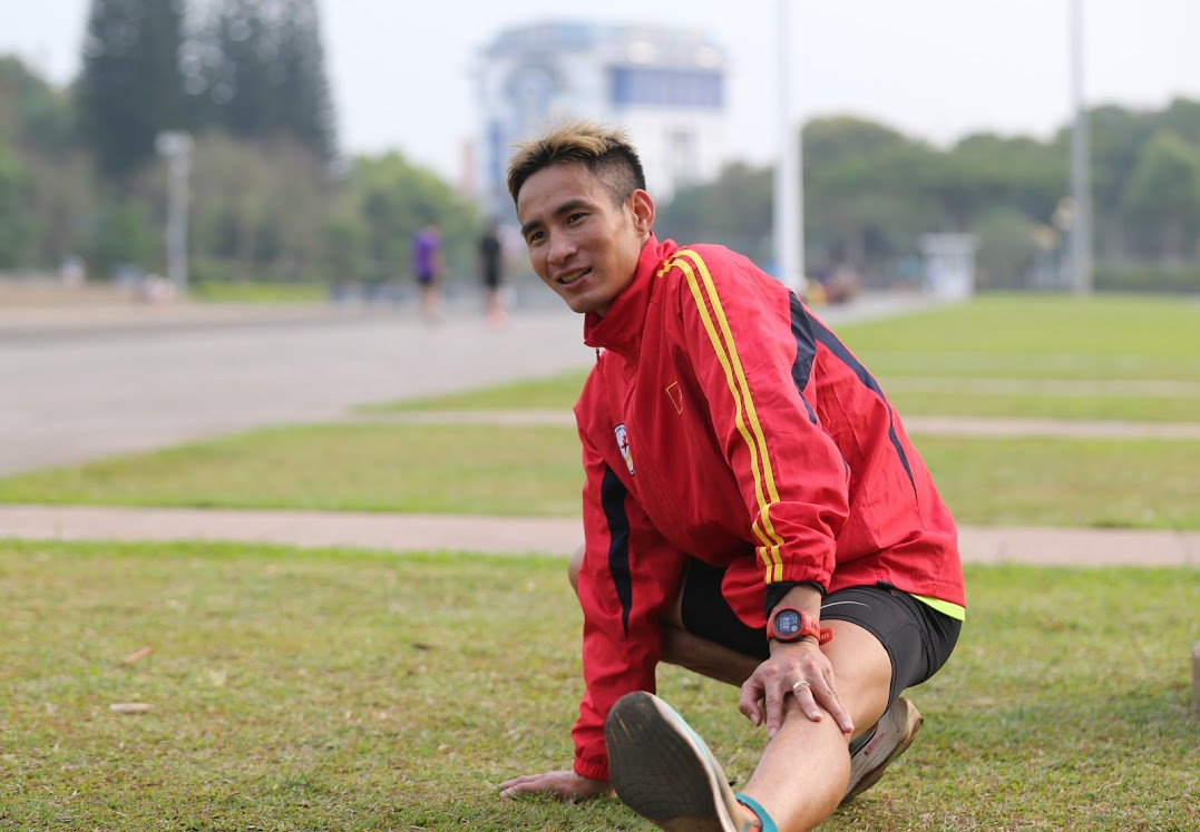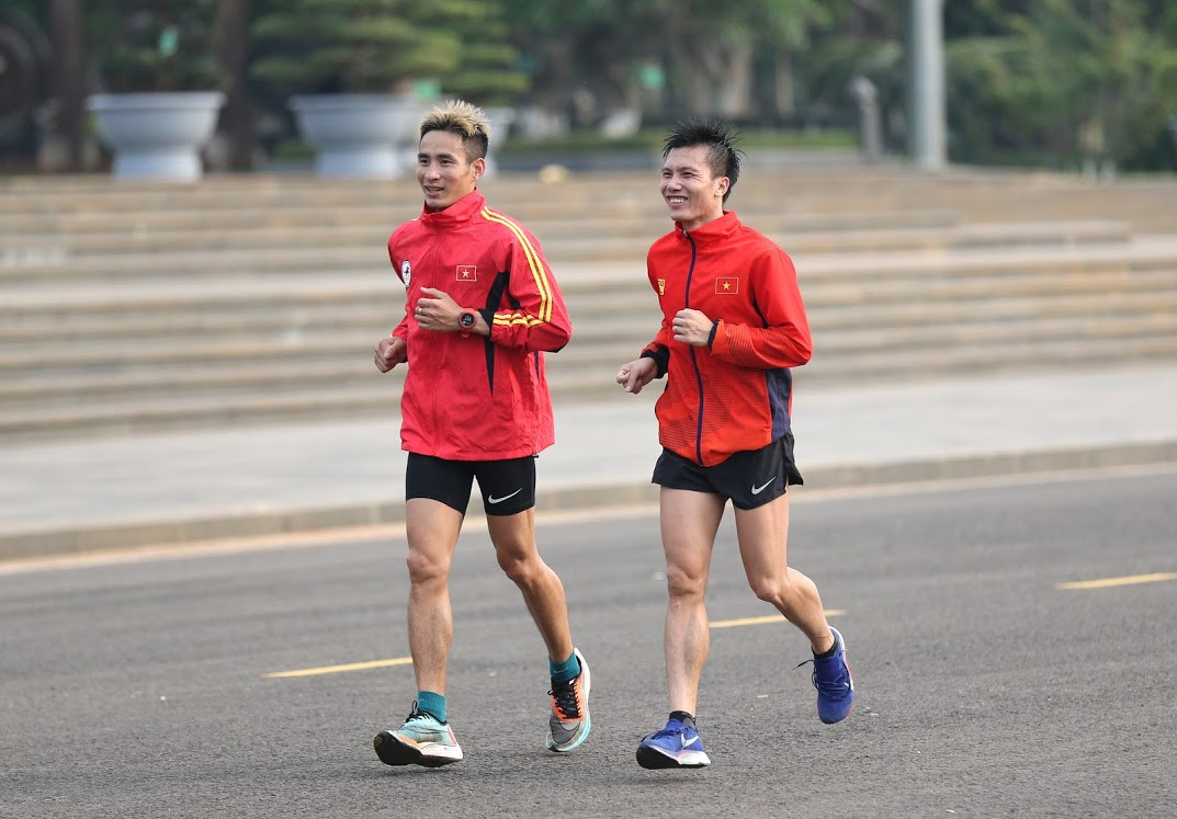 VĐV Đỗ Quốc Luật (phải- Quân Đội) 6 lần liên vô vô địch đoạt ngôi vô địch 10km nam tuyển, hứa hẹn sẽ có màn trình diễn đỉnh cao tại Tiền Phong Marathon 2021. Để chuẩn bị cho giải đấu này, từ nhiều tháng nay, anh đã miệt mài tập luyện, với 5 tiếng cùng 30-40km mỗi ngày trên đường chạy Nhổn.