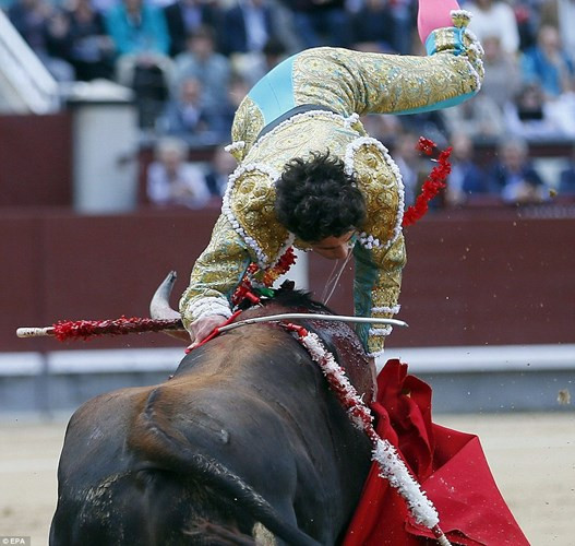 Còn đây là hình ảnh cuộc đấu bò tót ở Madrid của dũng sĩ đấu bò học việc người Tây Ban Nha David Martin Escudero.