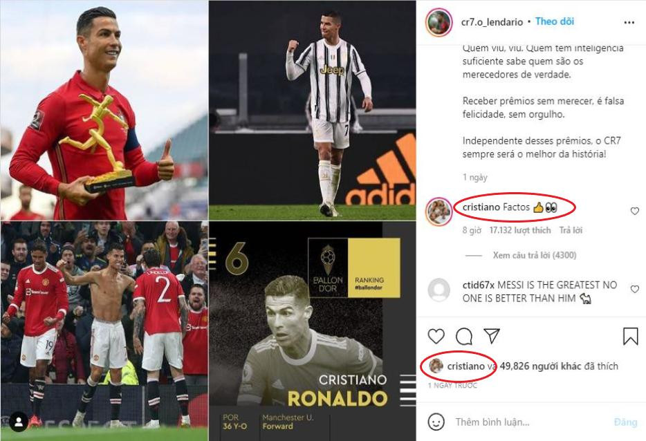 Bài viết này đang gây xôn xao trên khắp mạng xã hội khi được đích thân Ronaldo ủng hộ. Chủ nhân của 5 Quả bóng Vàng đã bấm like, anh thậm chí còn bình luận vào bài viết từ “Factos”, trong tiếng Bồ Đào Nha có nghĩa là “Sự thật”. Nhiều người hâm mộ trung lập cho rằng Ronaldo vẫn còn đang cay cú vì chỉ về thứ 6 trong cuộc đua Quả bóng Vàng 2021 và bị Messi bỏ xa tới 435 điểm.