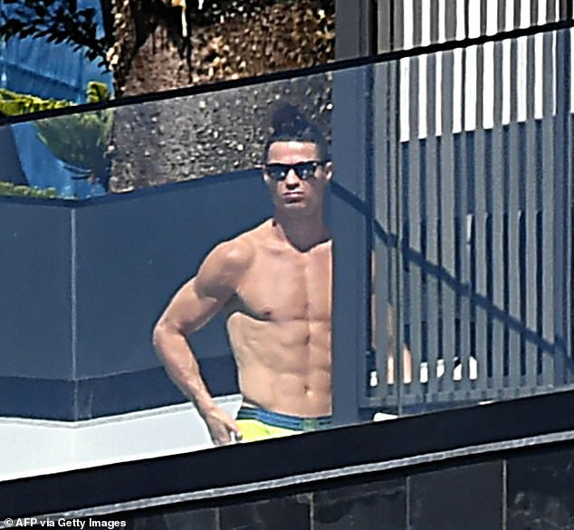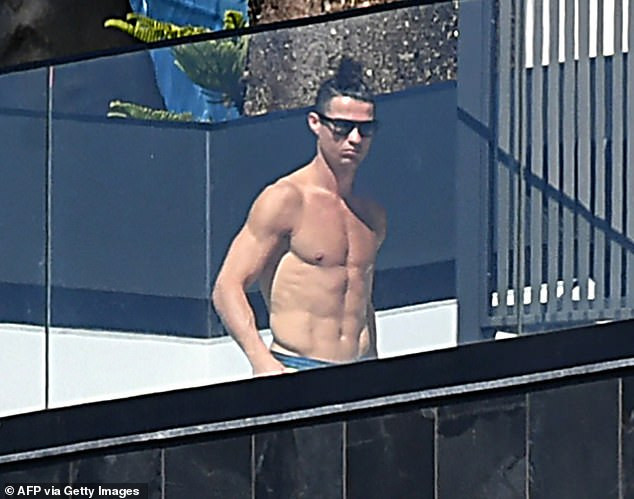 Cristiano Ronaldo đeo kính râm, cởi trần tắm nắng khoe body 6 múi vạm vỡ cơ bắp săn cuồn cuộn săn chắc trên ban công nhà riêng ở quê nhà Funchal, Madeira, Bồ Đào Nha hôm đầu tuần qua.
