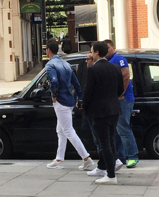Với áo xanh và quần trắng, Ronaldo có mặt tại một địa điểm khác ở London là khu Knightsbridge. Nơi này chỉ cách sân Stamford Bridge của Chelsea chỉ ba km.