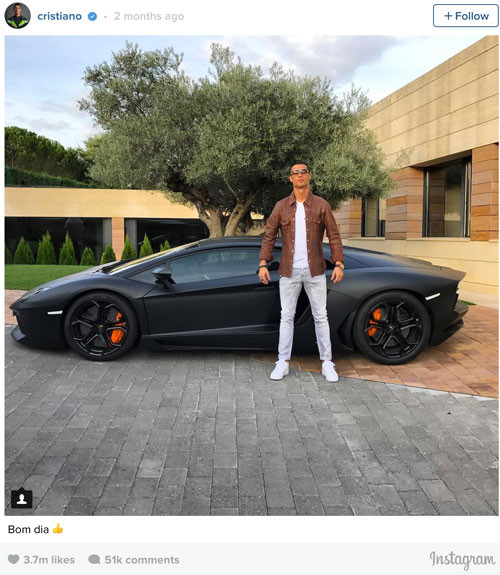 Trên Instagram, bức ảnh Ronaldo khoe siêu xe Lamborghini mới, nâng Cup EURO 2016 trên bục vô địch cùng đồng đội, giữ "khư khư" Cup EURO 2016 trên máy bay trở về nước hay gặp gỡ ngôi sao điện ảnh Jason Statham nhận được quan tâm nhất của người hâm mộ.