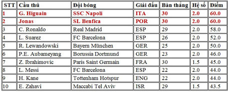 Cụ thể, tính tới thời điểm này, C.Ronaldo đã có 58 điểm sau khi ghi 29 bàn thắng ở La Liga. Anh vẫn kém hai người đứng đầu là Higuain (Napoli) và Jonas (Benfica) với khoảng cách 2 điểm (tương đương với 1 bàn thắng).