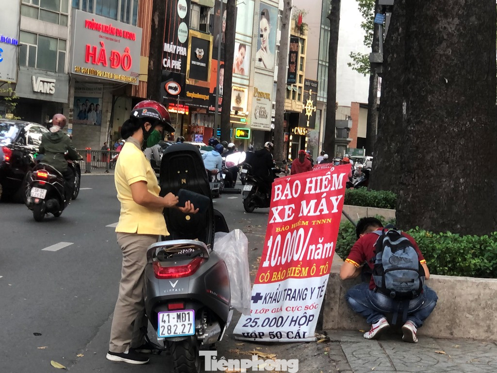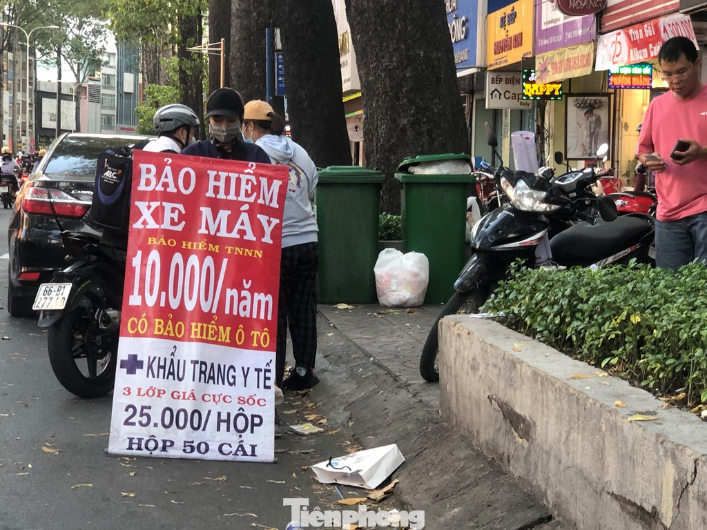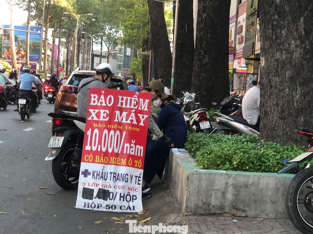 Ghi nhận chiều ngày 18/5, trên nhiều tuyến đường tại TPHCM như 3/2 (Q.10), Cách Mạng Tháng Tám (Q.Tân Bình), Lý Thái Tổ (Q.10), Xa lộ Hà Nội, Mai Chí Thọ (Q.2)… hàng chục điểm bán bảo hiểm xe máy vỉa hè giá từ 10.000-20.000 treo băng-rôn đỏ rực, nhân viên đứng sát lề đường chào mời khách.