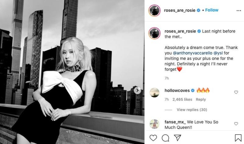 Rosé xuất hiện muộn hơn và đi cùng Giám đốc sáng tạo của Saint Laurent là nhà thiết kế người Bỉ Anthony Vaccarello. Sau màn xuất hiện này, cộng đồng người hâm mộ K-Pop đã nổ ra tranh cãi cực lớn về việc CL hay Rosé mới là người thực sự nhận được lời mời chính thức của BTC Met Gala.