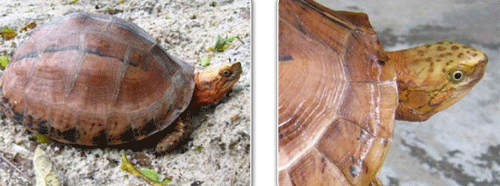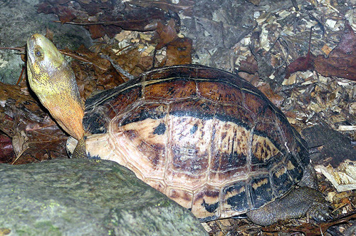 Rùa hộp trán vàng miền Nam (Cuora picturata) là loài đặc hữu của miền núi miền Nam Việt Nam và được Sách đỏ thế giới xếp vào loài cực kỳ nguy cấp. Mai của loài ngắn, gồ cao với các vệt màu đen. Màu sắc của đầu và các đốm đen cũng rất khác nhau giữa các cá thể cùng loài. Ảnh: Wikipedia.