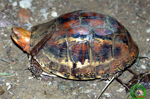 Rùa hộp trán vàng miền Trung (Cuora bourreti) là loài đặc hữu ở miền Trung Việt Nam, phân bố từ Khánh Hòa đến Thừa Thiên - Huế. Loài này có mai gồ với các vệt đen. Đầu rùa màu sắc sặc sỡ, màu vàng với những chấm đen nhạt. Ảnh: Sách hướng dẫn thi hành luật định dạng các loài rùa Việt Nam.