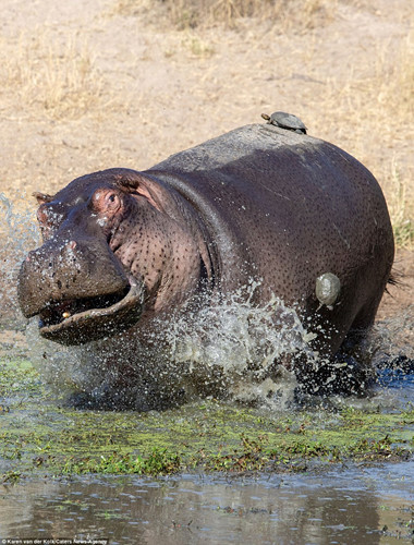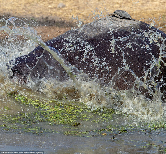 Trong ảnh là khoảnh khắc hà mã khổng lồ lắc mình thật mạnh, cố gắng rũ bỏ những con rùa nhỏ dai dẳng bám trên lưng.