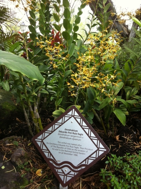 Điểm đặc biệt trong số 30 loài hoa có hình ảnh, thông tin được đăng trên hai tấm bảng khổ lớn là 29 loài đều có ảnh đi kèm là lãnh đạo và/hoặc phu nhân lãnh đạo các nước tới thăm Vườn Lan Quốc gia (hiện có hơn 1.000 loài tự nhiên và 2.000 loài lai - sản phẩm của chương trình lai tạo lan bắt đầu năm 1928).