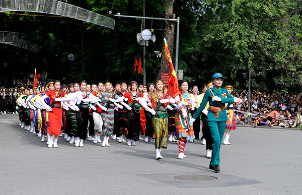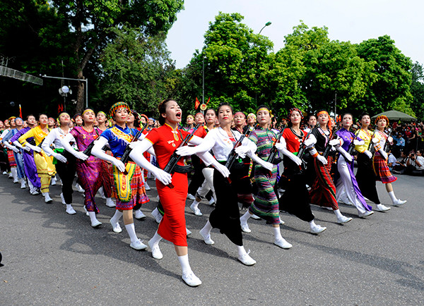 Khối Dân quân các dân tộc Việt Nam trong sắc phục muôn màu rực rỡ