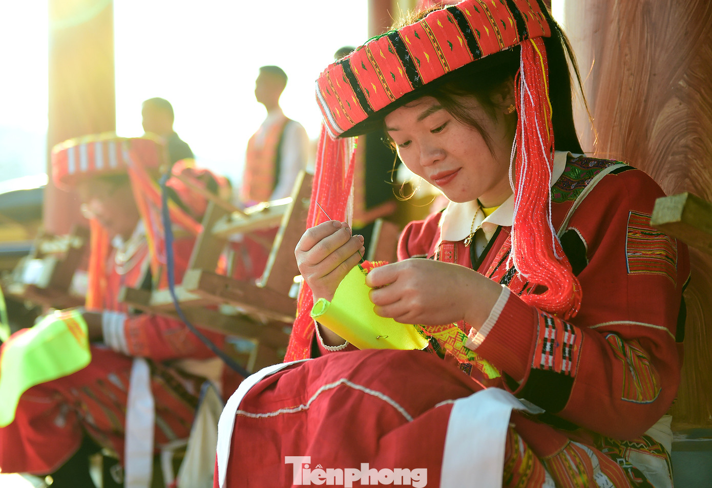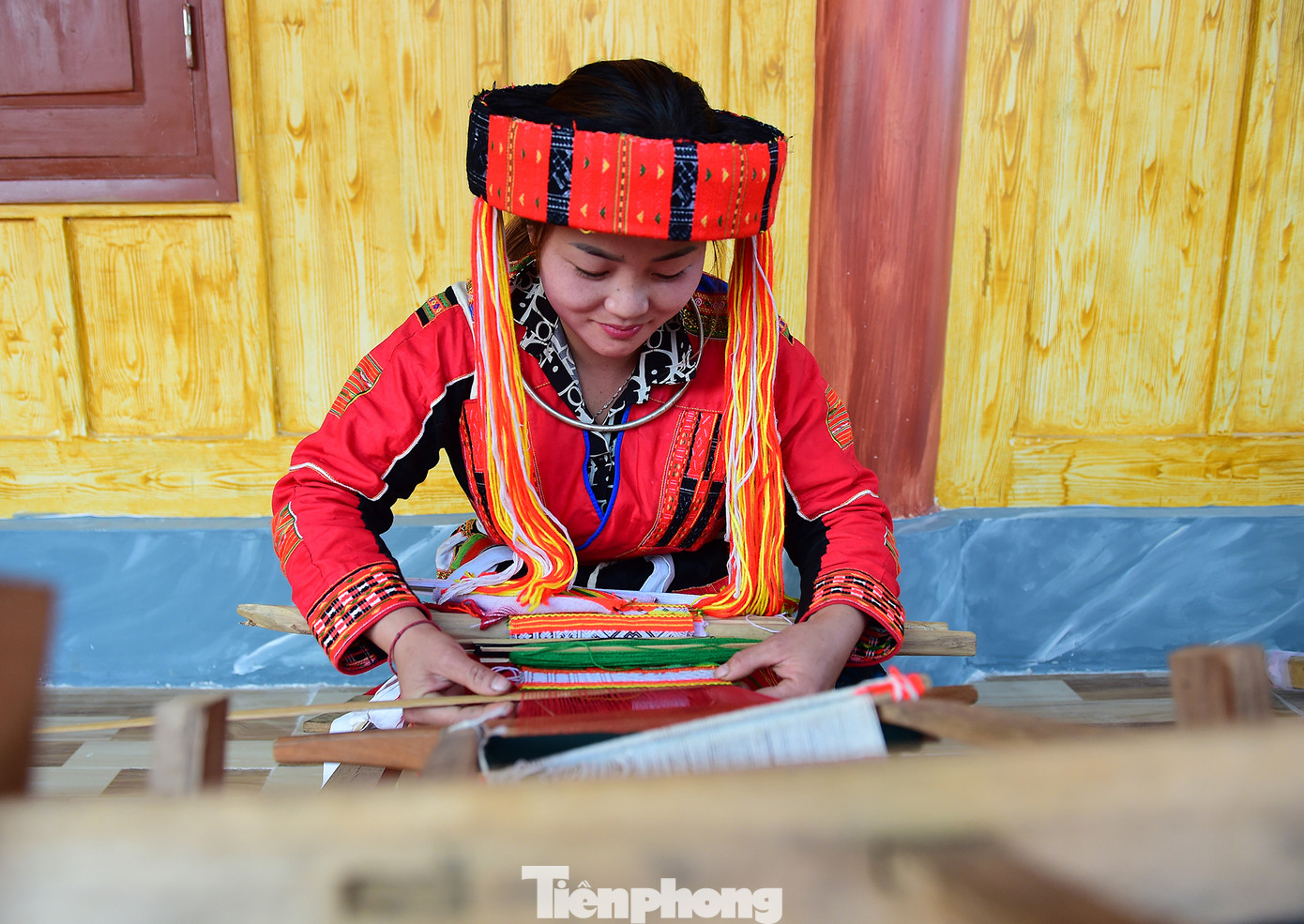 | Dịp này, các cô gái Pà Thẻn thể hiện khả năng dệt vải và đường kim mũi chỉ trong ngày vui khánh thành Nhà văn hóa cộng đồng dân tộc Pà Thẻn. |
