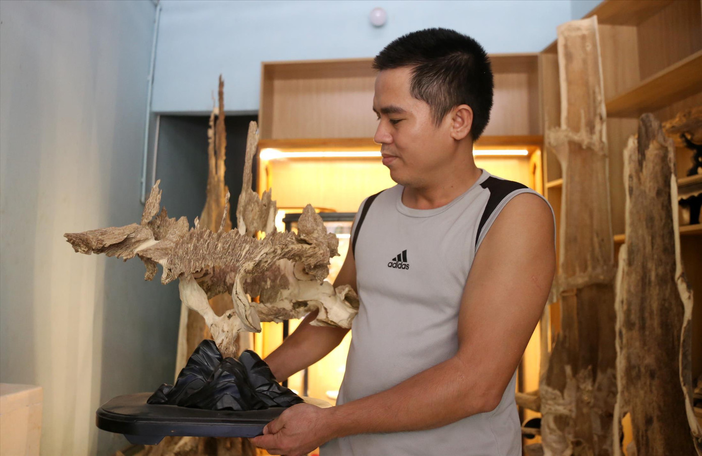 Ông chủ trẻ khá cởi mở chia sẻ khi chúng tôi ngỏ ý muốn tìm hiểu thông tin về nghề chế tác trầm cảnh. 38 tuổi, anh Lĩnh có 15 năm trong nghề xoi trầm. Anh nói rằng mình may mắn khi được bố vợ truyền nghề, rồi gắn bó đến nay. Hiện, hai vợ chồng đã mở được cơ sở sản xuất trầm hương Mai Lĩnh và tạo việc làm cho nhiều lao động địa phương.