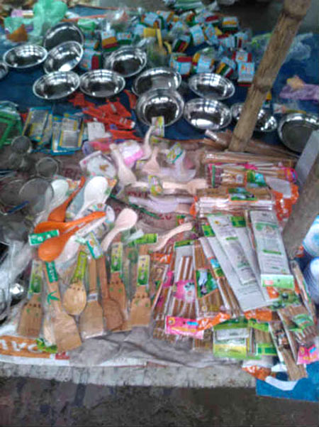 Những chiếc thìa xới cơm, đảo thực phẩm bằng gỗ xuất xứ từ Trung Quốc đang được bày bán tràn lan. Với giá từ 7.000- 10.000 đồng, những chiếc thìa gỗ này là lựa chọn của nhiều gia đình có thu nhập bình dân.