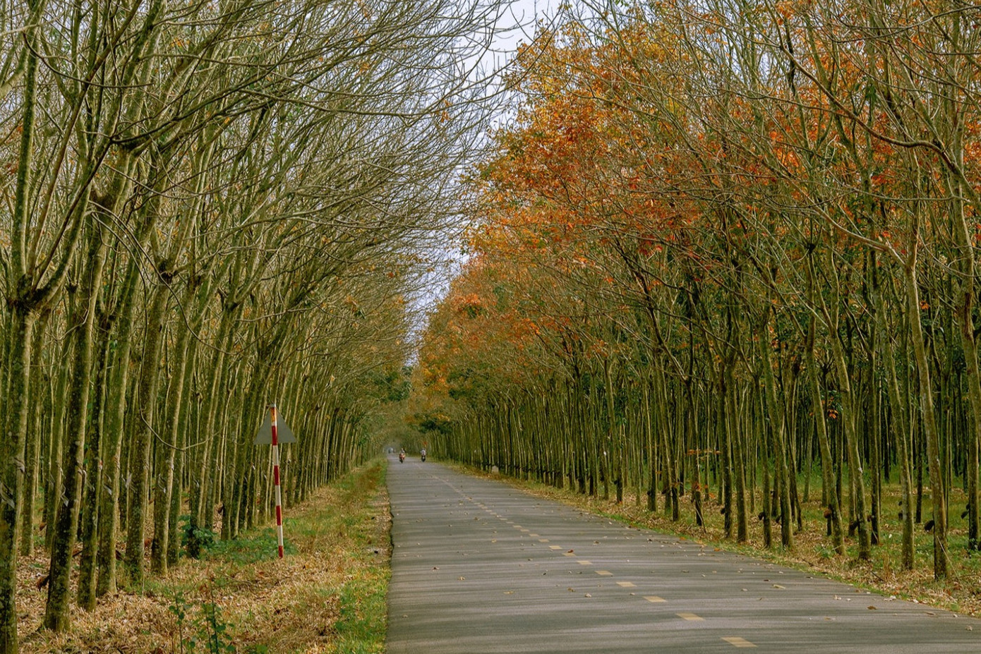 Rừng cao su ở Dầu Tiếng chuyển lá vàng, đỏ, đẹp lãng mạn như những thước phim Hàn Quốc, Nhật Bản vào thu là điểm đến thu hút nhiều du khách mê chụp ảnh trong kì nghỉ Tết Nguyên đán.