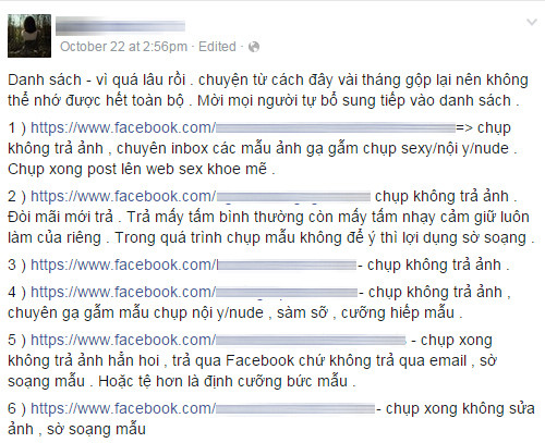 Một cô gái trẻ có tên Nhung Trần Thị đã gây sóng gió trên cộng đồng mạng khi bức xúc và đăng tải hàng loạt link trang cá nhân của nhiều người được cho là đã gạ gẫm chụp ảnh nude, gạ tình, có những hành động sờ soạng với người mẫu hoặc tệ hơn là đăng tải ảnh trên các trang web không lành mạnh.