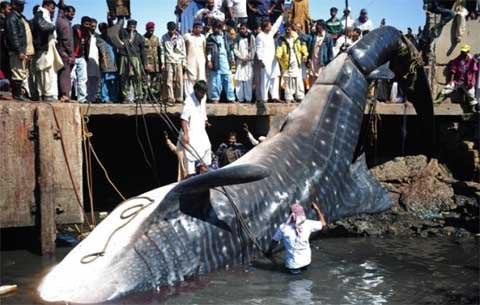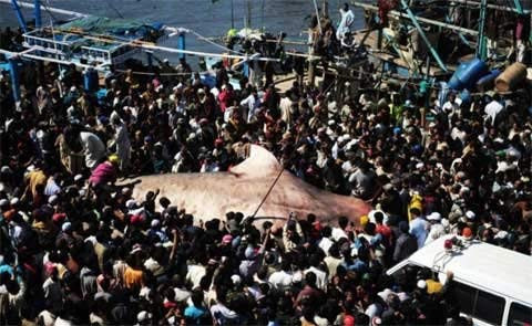 Nhiều người đã đổ xô tới chiêm ngưỡng con cá mập voi, một trong số những con to nhất từng bị bắt, khi nó được đưa khỏi mặt nước tại ngư trường Charai.