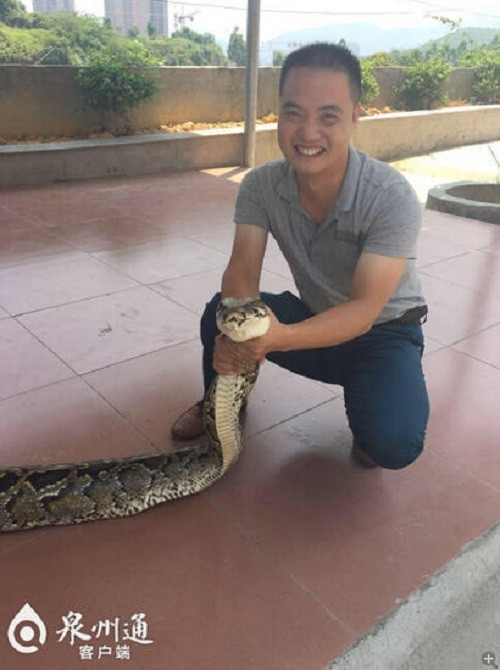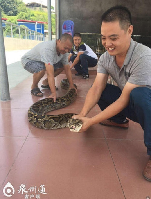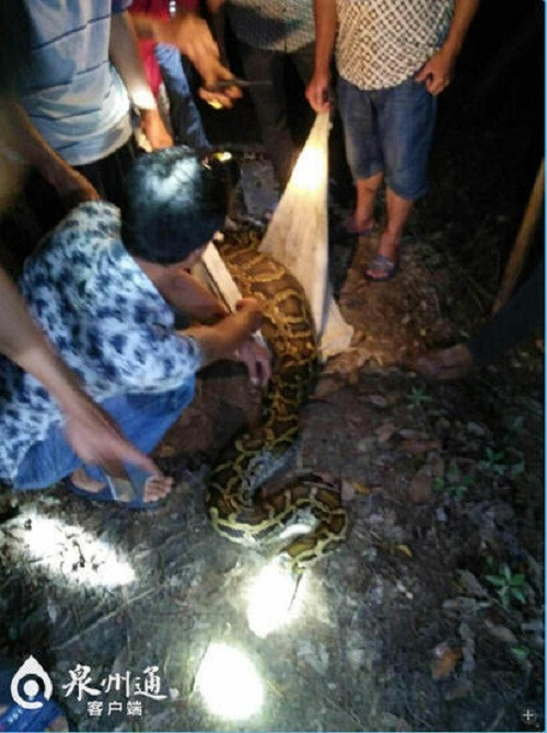 Tối ngày 26/7, người dân bắt được một con trăn khổng lồ ở thôn Trân Sơn, huyện An Khê, thành phố Tuyền Châu, phía nam tỉnh Phúc Kiến, Trung Quốc. Khi đó, con trăn vừa nuốt xong một con dê nặng khoảng 20 kg trong trang trại nhà ông Trần Phúc Kim.