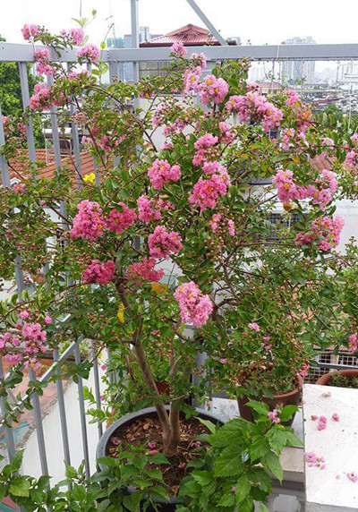 Ngay từ khi xây nhà, ông Vũ đã dự tính trước việc làm vườn trên sân thượng. Phần móng, kết cấu nhà được làm cẩn thận, chắc chắn. Các chậu cây cỡ đại cũng được cẩu lên, đặt sẵn trước trên sân. Từng làm trong ngành xây dựng, ông Vũ tự đi mua nguyên vật liệu về làm khung giàn với hệ thống phun nước tự động tiện lợi.