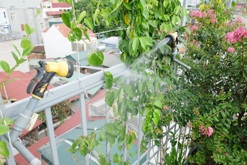 Tự lắp đặt hệ thống giàn, tưới nước tự động nên chủ vườn biết chính xác vị trí phù hợp để cây nào cũng nhận được nước. Hàng ngày, ông bà vẫn thích tự tưới bằng vòi phun thông thường còn hệ thống tự động dành để con cái giúp đỡ khi bố mẹ đi vắng nhiều ngày.