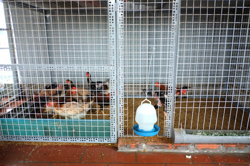 Chuồng nuôi khoảng chục chú gà nhưng không có mùi hôi nhờ có rải lớp bột khử mùi ở trấu. Phân gà được ủ kết hợp với nước tiểu pha loãng giúp cây lên nhanh như thổi.