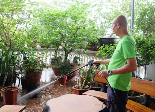 Gia đình có ít người, vườn rộng cả trăm m2 nhưng ông bà vẫn tự chăm cây. Dù đi chơi đâu, hai người vẫn phải xong xuôi việc tưới nước lúc sáng sớm và tầm 16-17h.