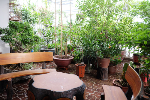 Không gian sống mới có cây xanh kín các ban công, tầng một có hồ cá Koi, sân của tầng 6-7 có diện tích hơn 100 m2 chỉ để trồng cây. Ngoài tiền đầu tư cho khung giàn, kệ trồng rau, gia đình còn bỏ nhiều tiền để mua cây. Ngày nào, ông bà cũng dành tới 2 tiếng mới chăm sóc hết cho các cây, làm sạch mặt sân.