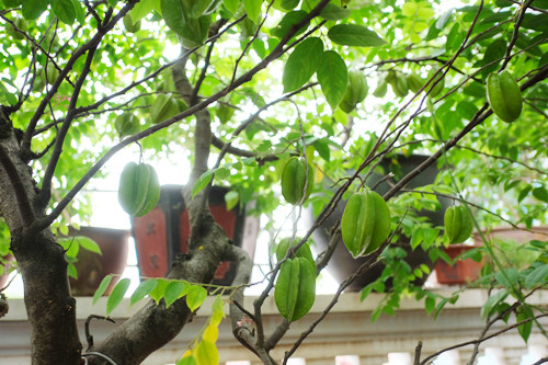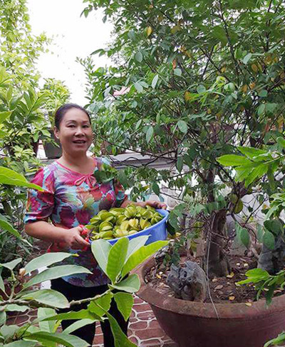 Bà Liên với mẻ khế trong vườn nhà. "Nhiều lúc gia đình không dám hái ăn, chỉ muốn rau trái mãi trên cây để ngắm cho thích", bà Liên tâm sự.