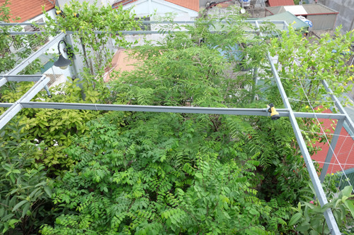 Nằm trong một con hẻm ở quận Ba Đình (Hà Nội), nhà ông Trương Văn Vũ - bà Trần Bích Liên thu hút từ xa bởi màu xanh xuất hiện khắp ban công và trên mái. Nhìn từ trên cao, phần mái xanh của tầng 6-7 nổi bật giữa rừng mái tôn xanh đỏ xung quanh