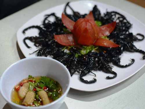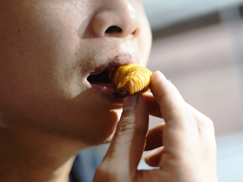 Đồng hồ bấm giờ bắt đầu chạy, anh Nhật vội đưa vào miệng thật nhanh những con đuông dừa và chỉ trong 30 giây là hết sạch, anh chuyển sang “chén” món bò cạp chiên và chỉ trong vài phút là sạch đĩa. Nhân viên nhà hàng báo hết giờ, anh Nhật là người thứ 10 thắng cuộc trong số 100 người tham gia cuộc thi diễn ra trong 10 ngày gần đây.