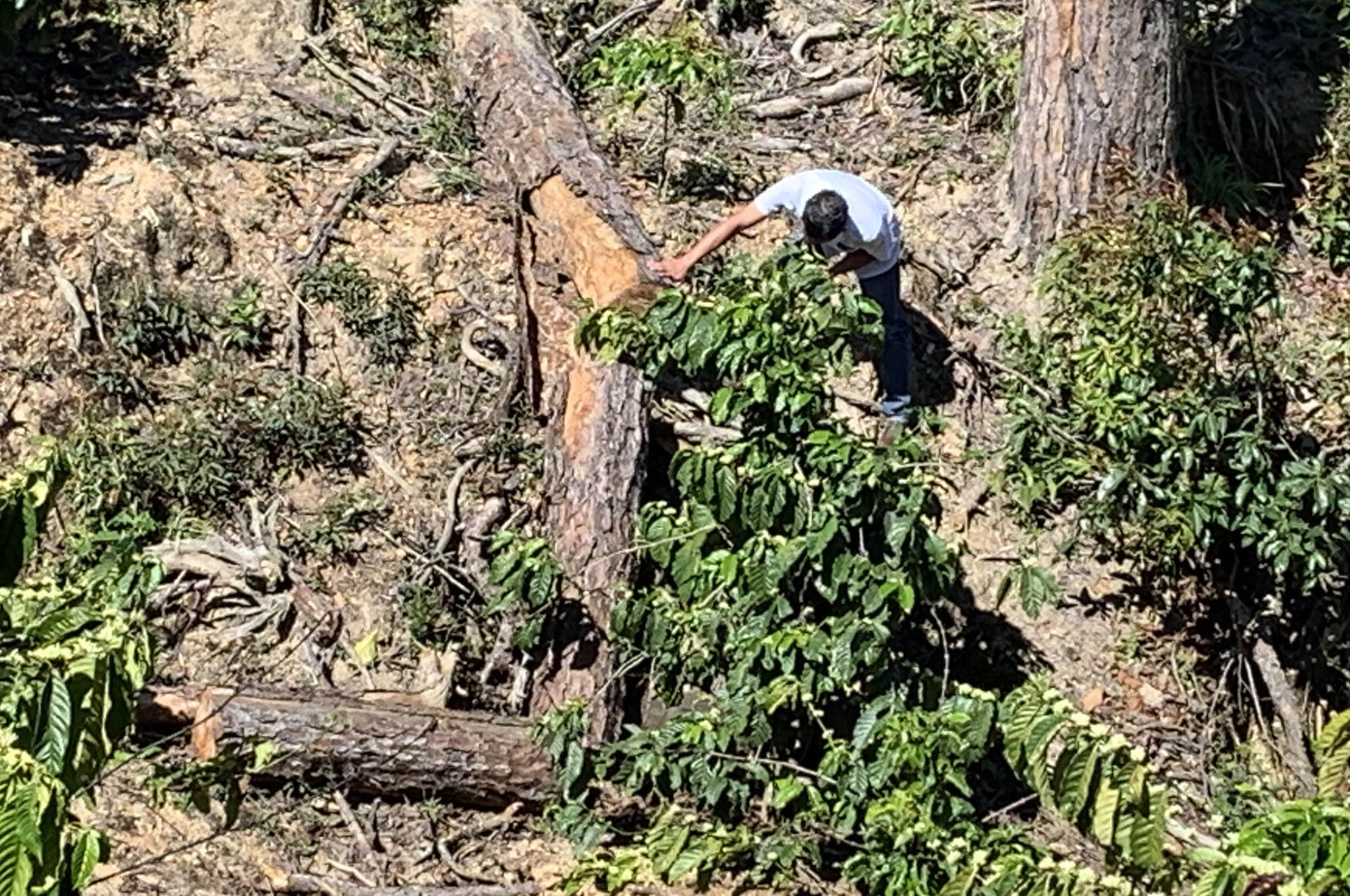 Hàng trăm cây thông có đường kính gốc từ 10cm – 60cm, cao hàng chục mét bị đầu độc chết đứng; bị cưa hạ, cắt khúc mang đi hoặc đốt gốc, đốt cây để phi tang. Dưới những gốc thông bị cưa hạ, các hố đất được múc xuống để trồng cà phê, mắc ca…